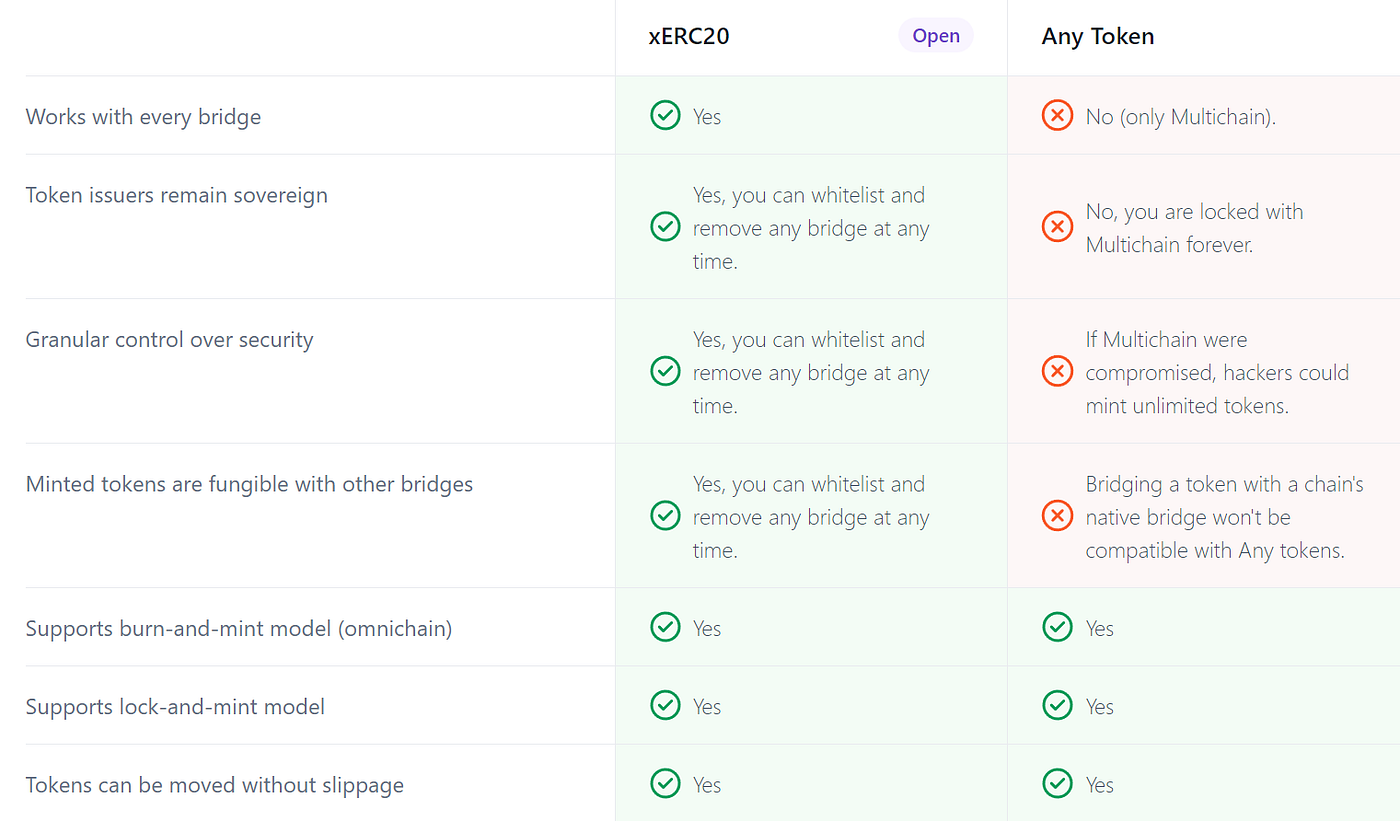 Comparative Table between xERC20 and any Token Standards